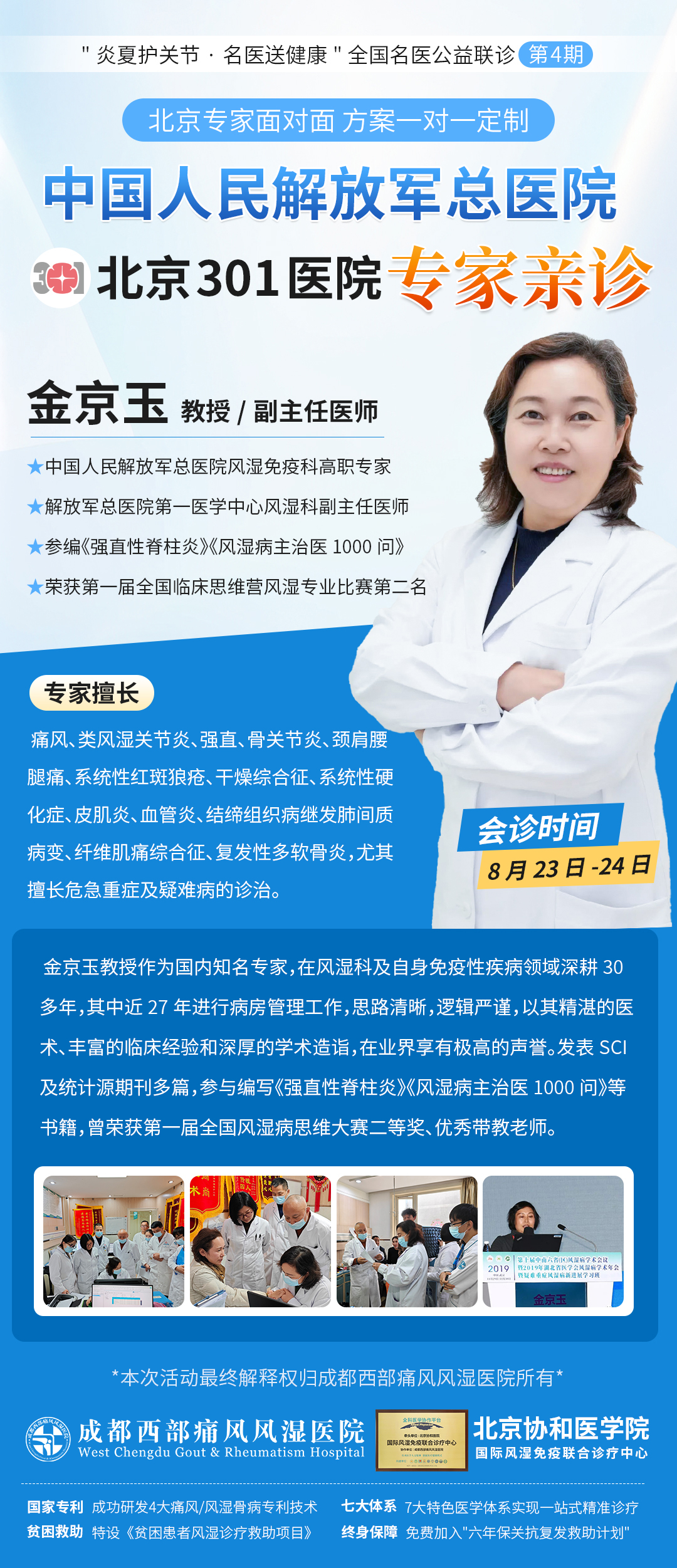 中国人民解放军总医院(北京301医院) 风湿免疫科高职专家金京玉教授领衔,联合京川名医团队,开展疑难重症病例专场会诊,为您提供精准诊疗方案,达到长久治痛抗复发!