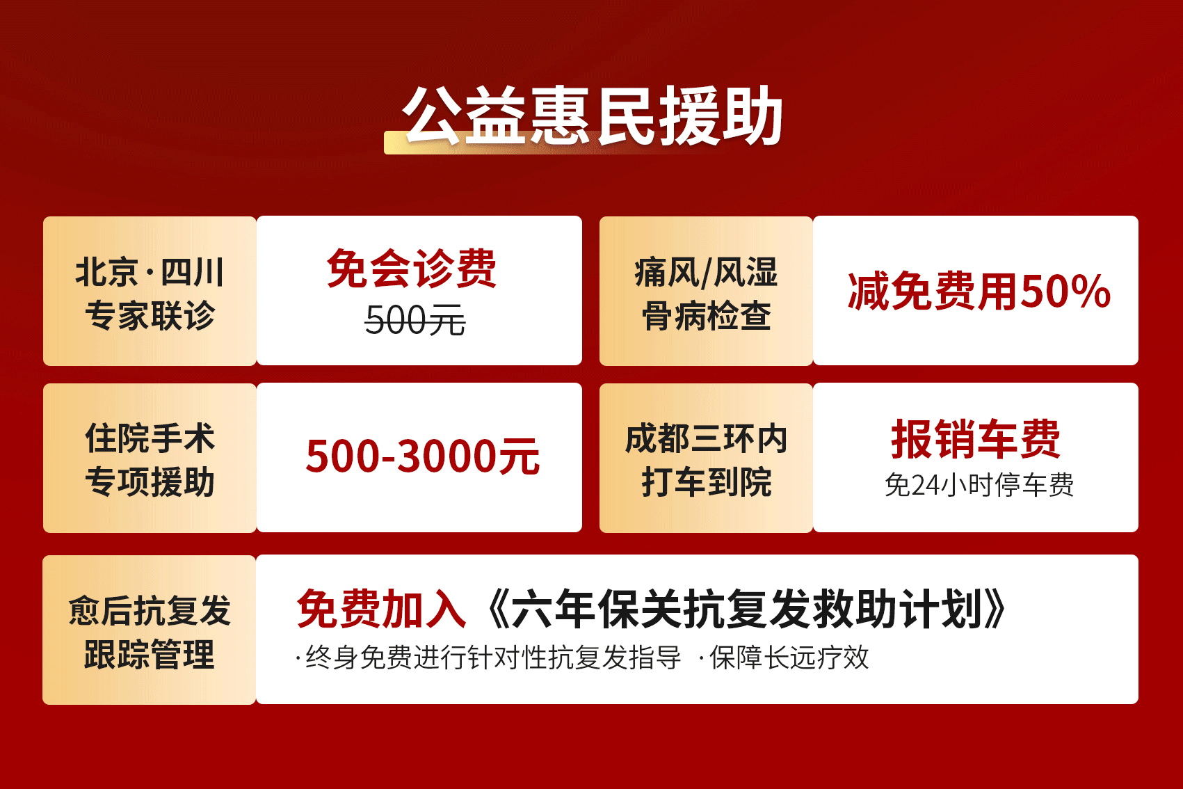 同步征集100名重度痛风、风湿骨病疑难重症患者,会后由众多三甲专家开展联合公益会诊,根据患者的个体情况,制定完整的个性化综合治疗方案,助力患者早日康复。